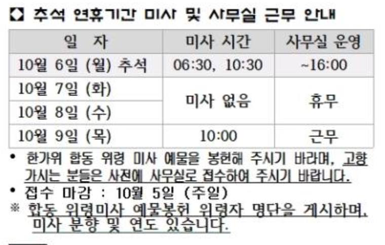 추석 연휴기간 미사 및 사무실 근무 안내